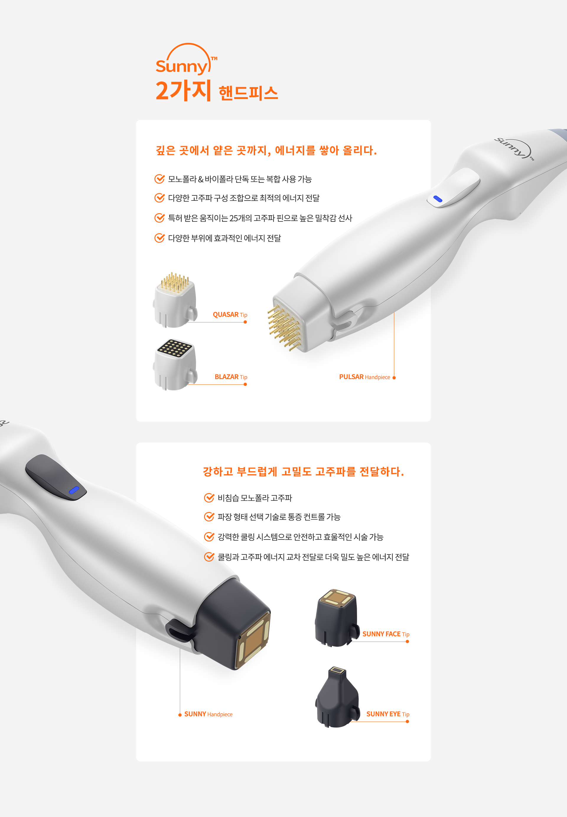 6.78MHz 고주파를 사용하며, 콜라겐 재생을 유도하고, 다양한 핸드피스(써니/펄사)를 통해 얼굴 윤곽, 처짐, 주름, 피부톤, 색소침착 등 복합적인 피부 고민을 개선할 수 있습니다.