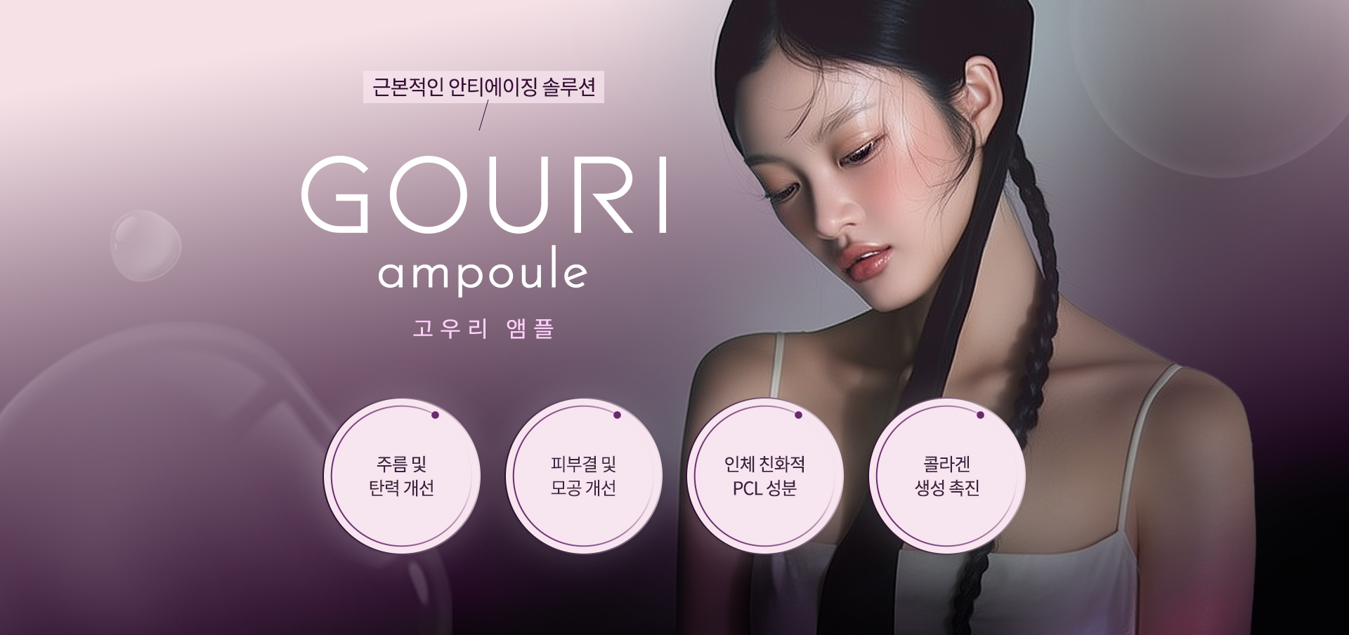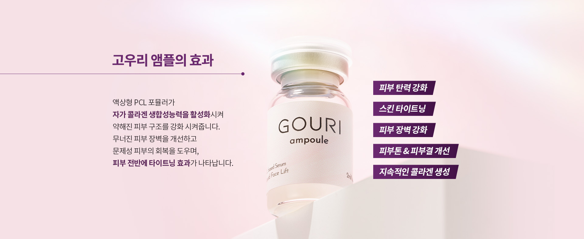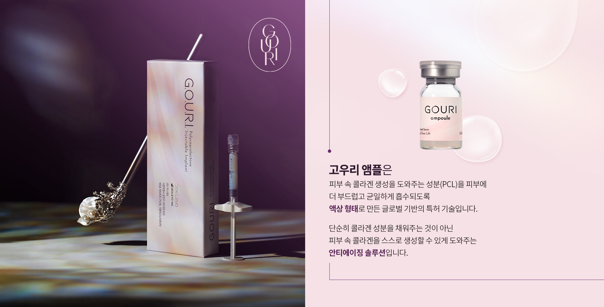 고우리 앰플은 피부 속 콜라겐 생성을 도와주는 성분(PCL)을 피부에 더 부드럽고 균일하게 흡수되도록 액상 형태로 만든 글로벌 기반의 특허 기술입니다.