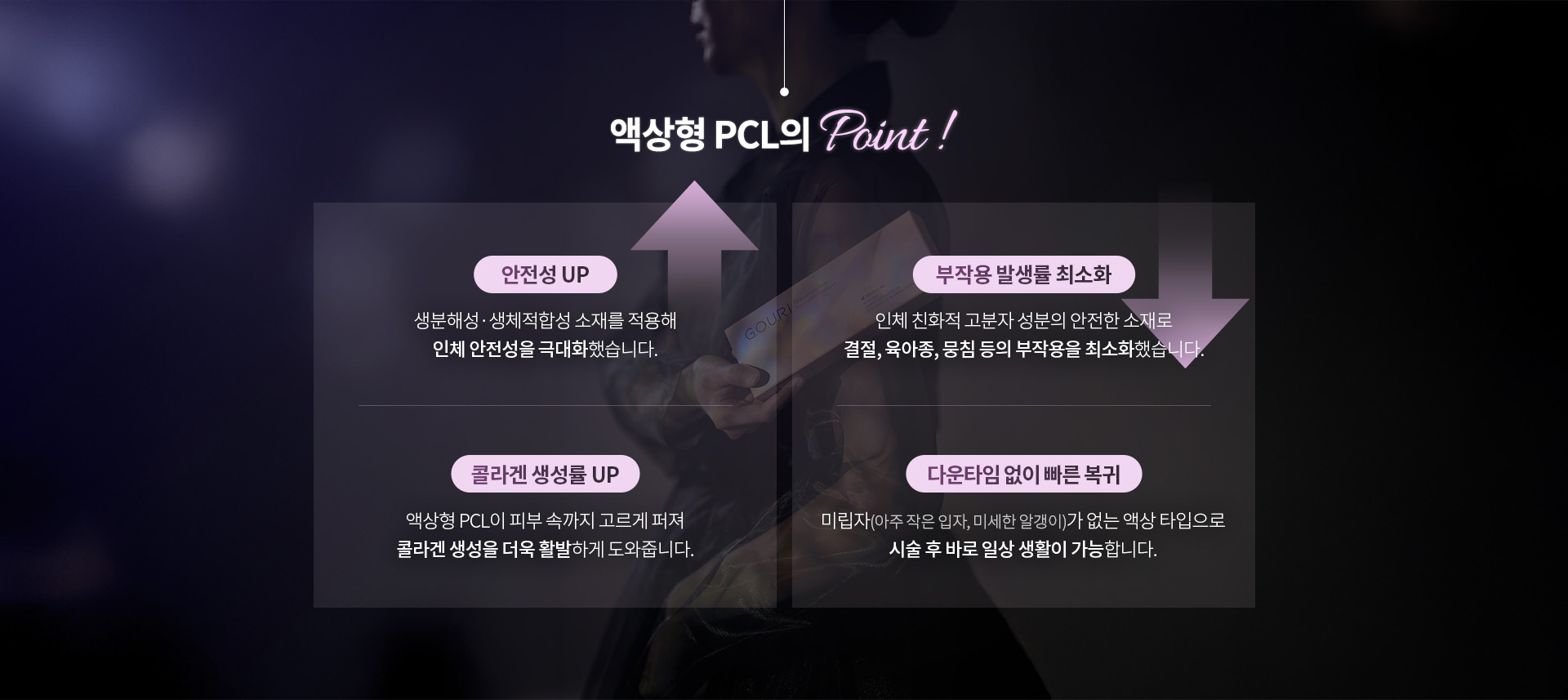 액상형 PCL 포뮬러가 자가 콜라겐 생합성능력을 활성화시켜 약해진 피부 구조를 강화 시켜줍니다. 무너진 피부 장벽을 개선하고 문제성 피부의 회복을 도우며, 피부 전반에 타이트닝 효과가 나타납니다.
