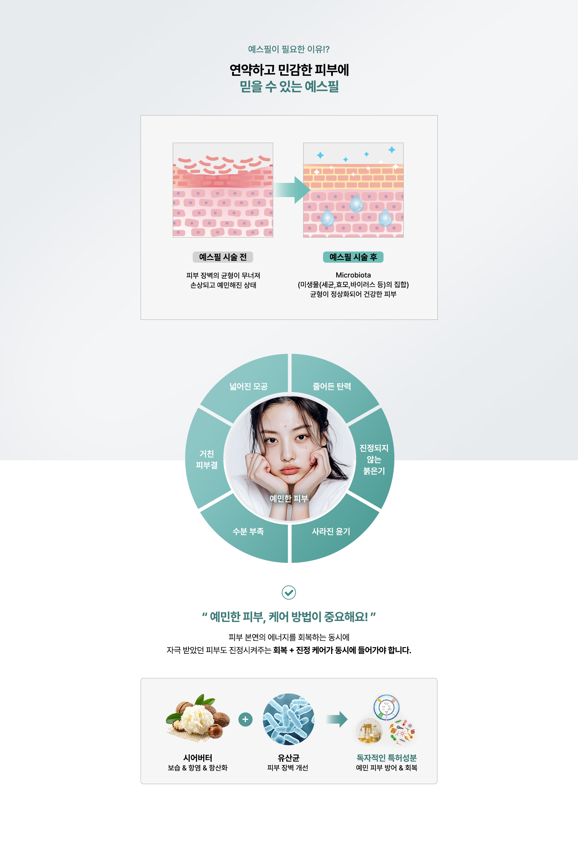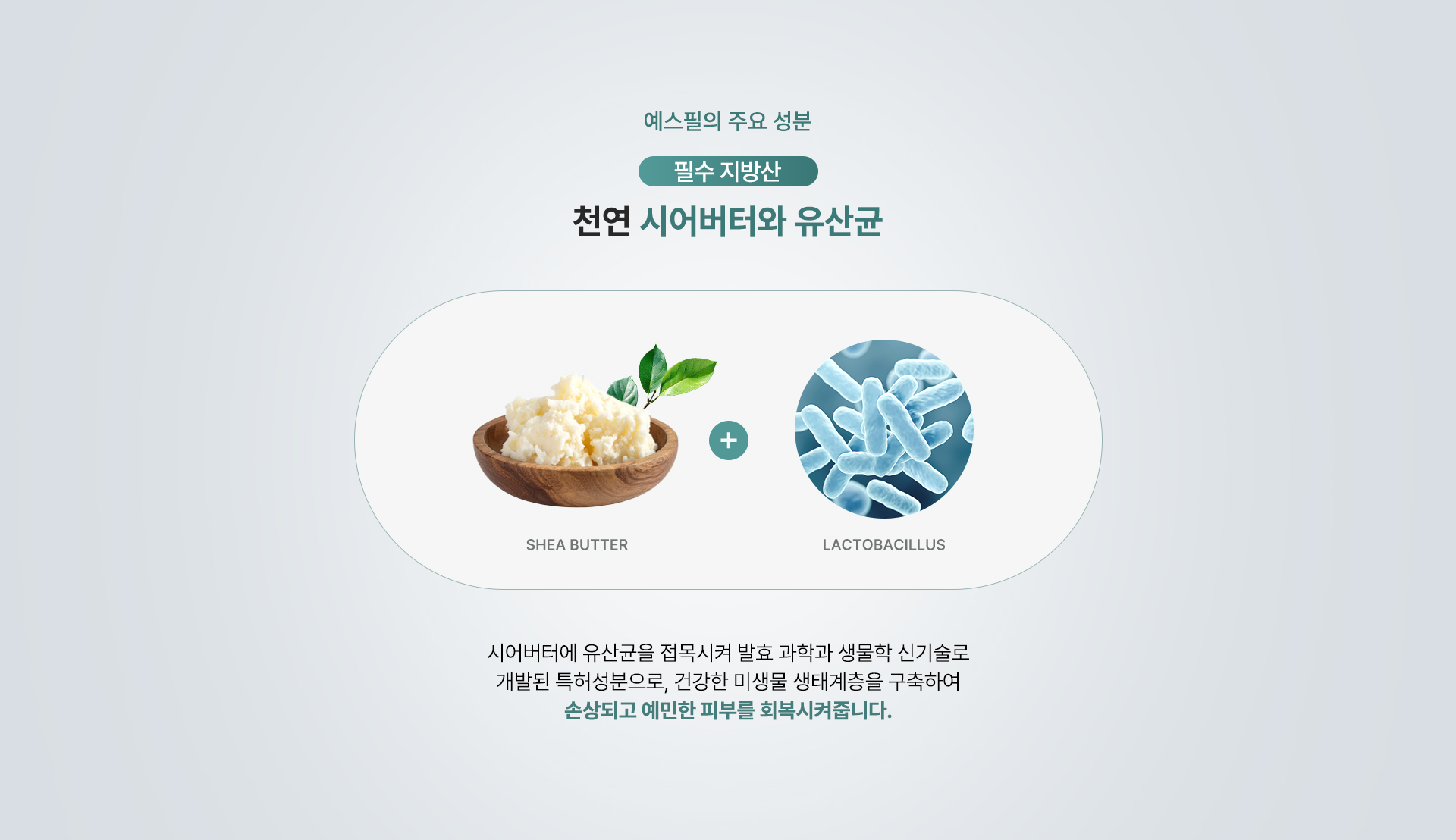 시어버터에 유산균을 접목시켜 발효 과학과 생물학 신기술로 개발된 특허성분으로, 건강한 미생물 생태계층을 구축하여 손상되고 예민한 피부를 회복시켜줍니다.