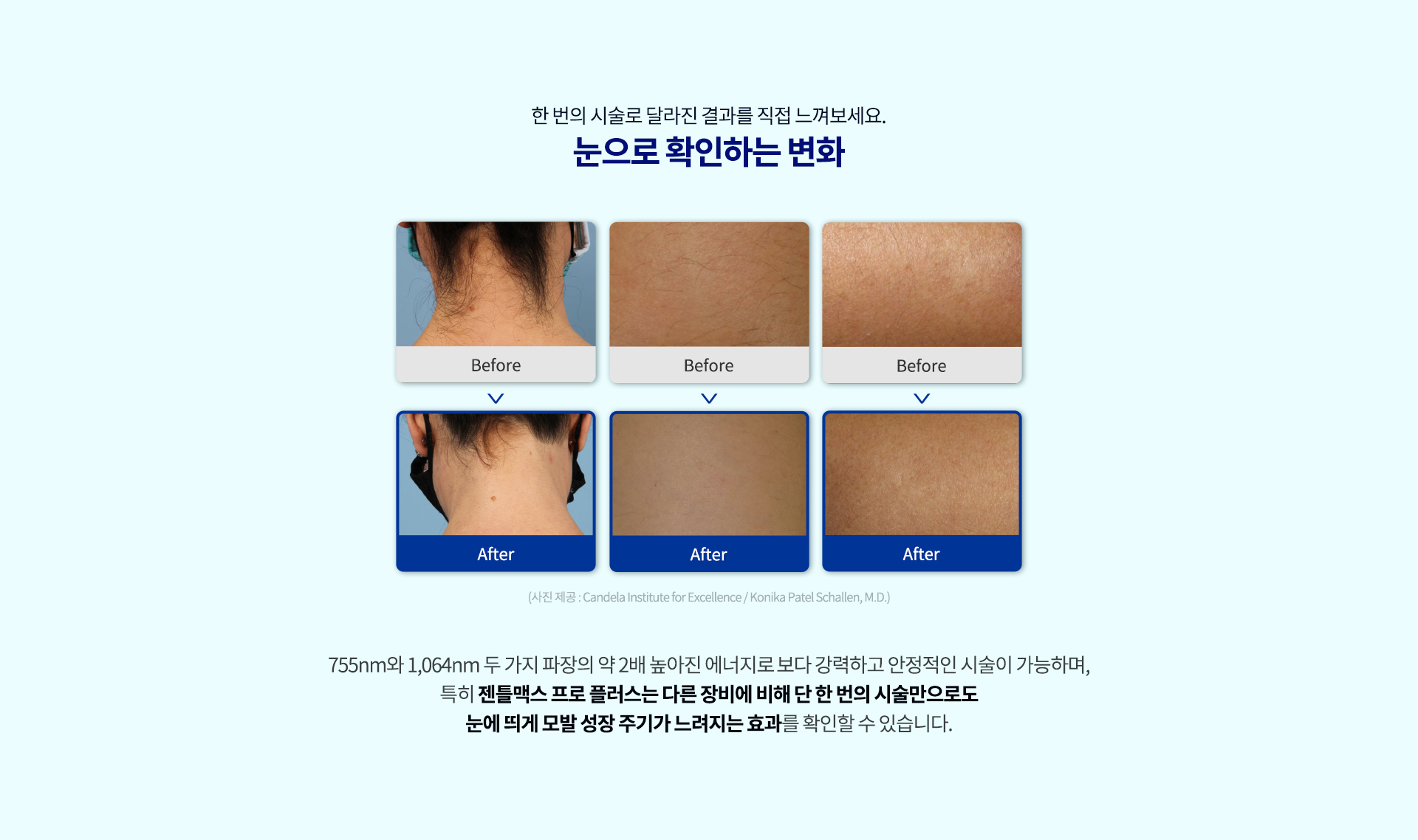 755nm와 1,064nm 두 가지 파장의 약 2배 높아진 에너지로 보다 강력하고 안정적인 시술이 가능하며, 특히 젠틀맥스 프로 플러스는 다른 장비에 비해 단 한 번의 시술만으로도 눈에 띄게 모발 성장 주기가 느려지는 효과를 확인할 수 있습니다.