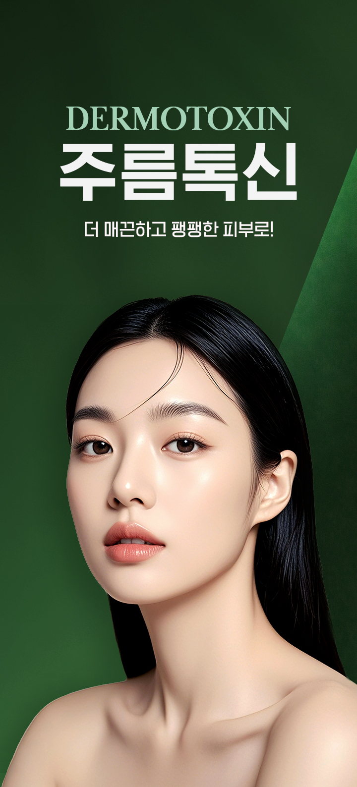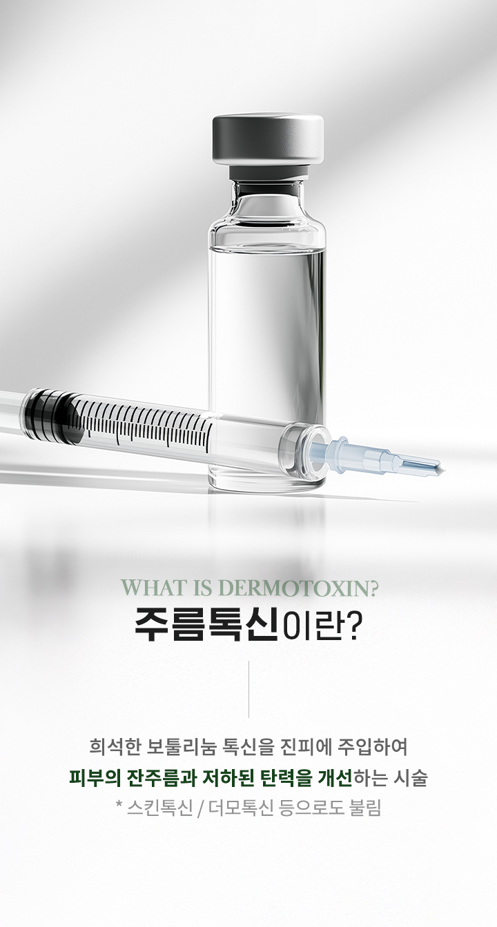 주름톡신(더모톡신)은 피부를 뜻하는 ‘더모(dermo)’와 보툴리늄톡신의 ‘톡신(toxin)’이 결합된 합성어로, 톡신을 피부층에 주입해 표정주름은 자연스럽게 개선하고 탄력 개선 효과도 더불어