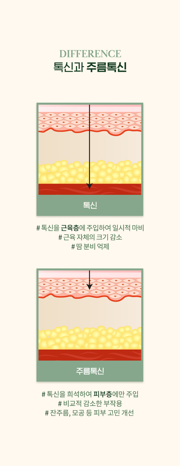 잔주름, 미세주름의 경우 피부 표피층에 보톡스를 주입하여 피부층을 팽팽하게 만들어 개선해주는 효과가 있습니다.