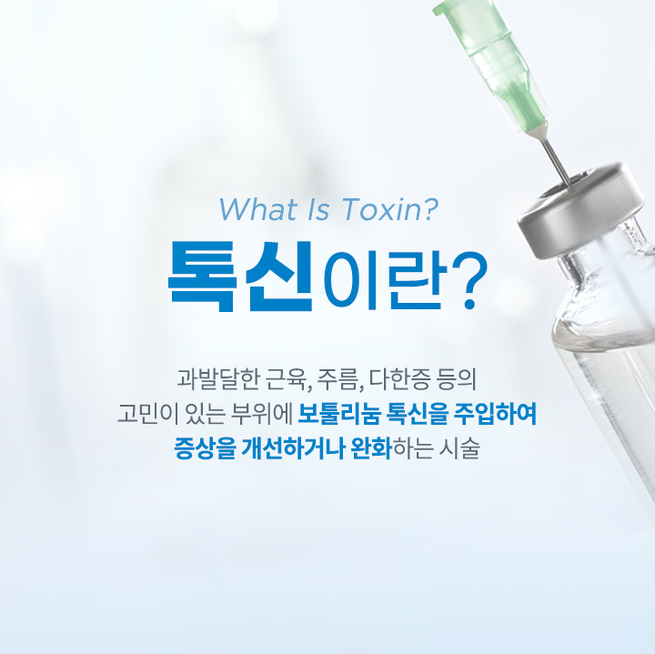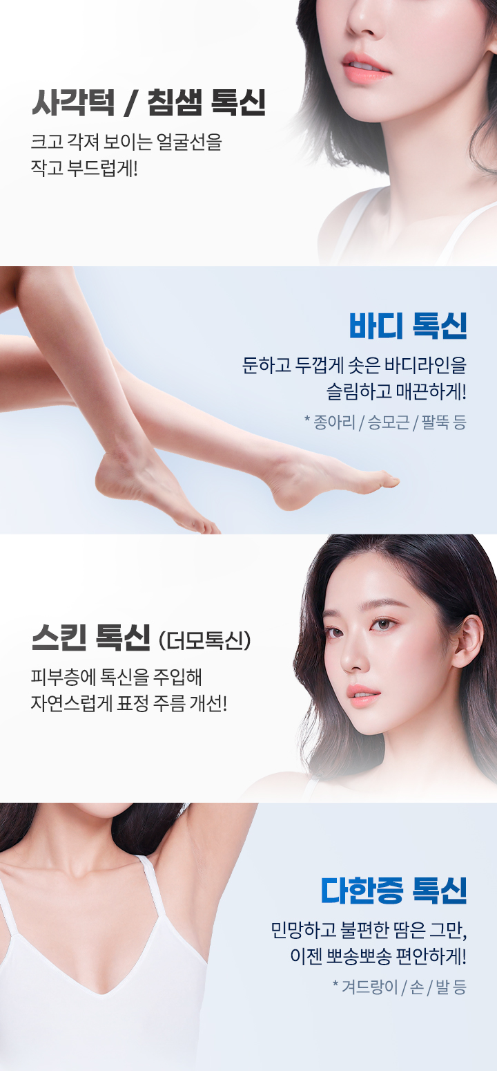 사용하는 약물은 같지만 약물의 농도와 주입 방식이 다릅니다. 사각턱, 바디톡신은 근육층에 톡신을 주입하여 근육의 이완으로 효과를 본다면, 주름/더모톡신의 경우, 피부층에 주입하여 전체적인 주름의 자연스러운 개선, 피부 결 개선, 리프팅, 모공 축소 등 다양한 효과를 얻을 수 있습니다.