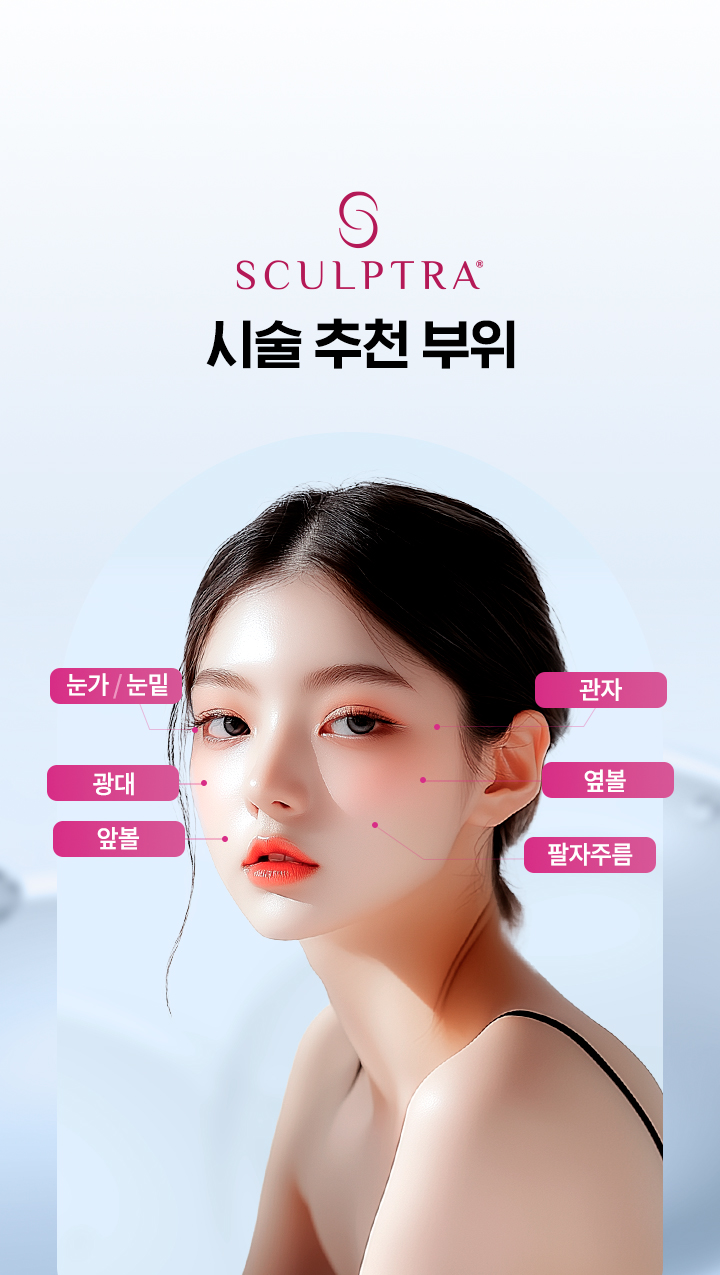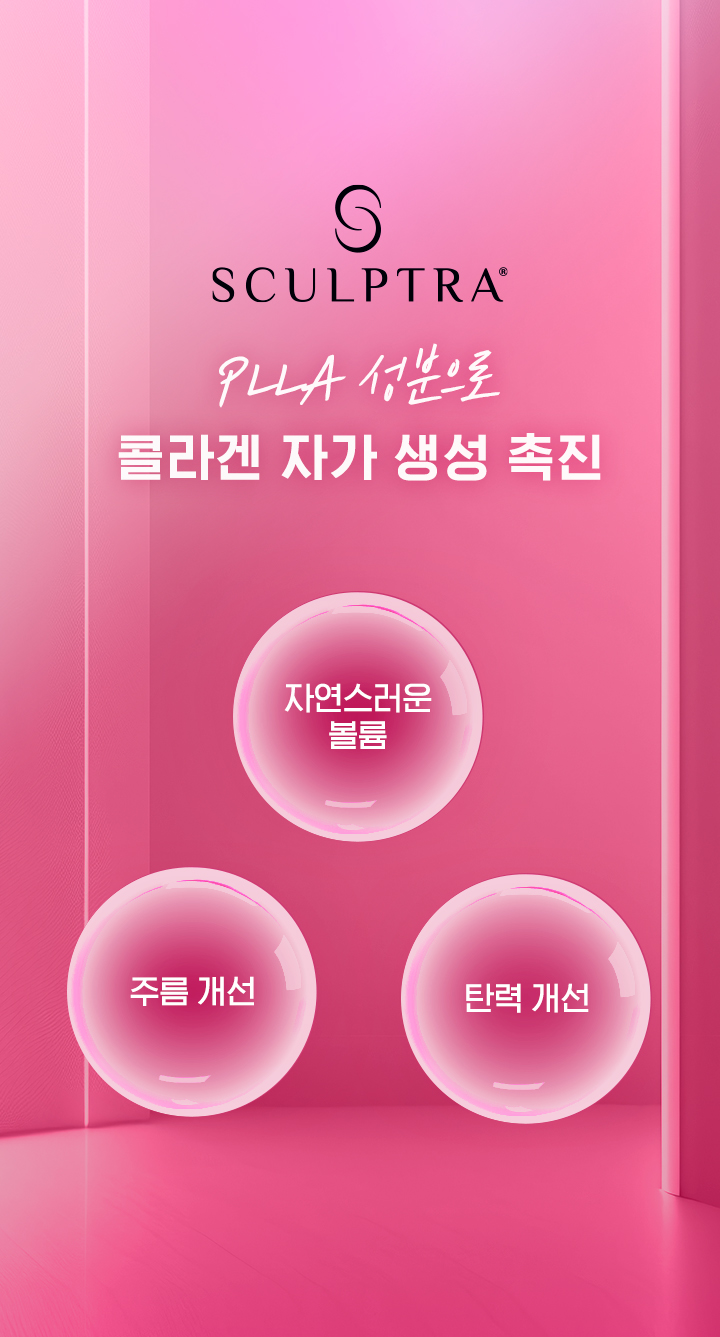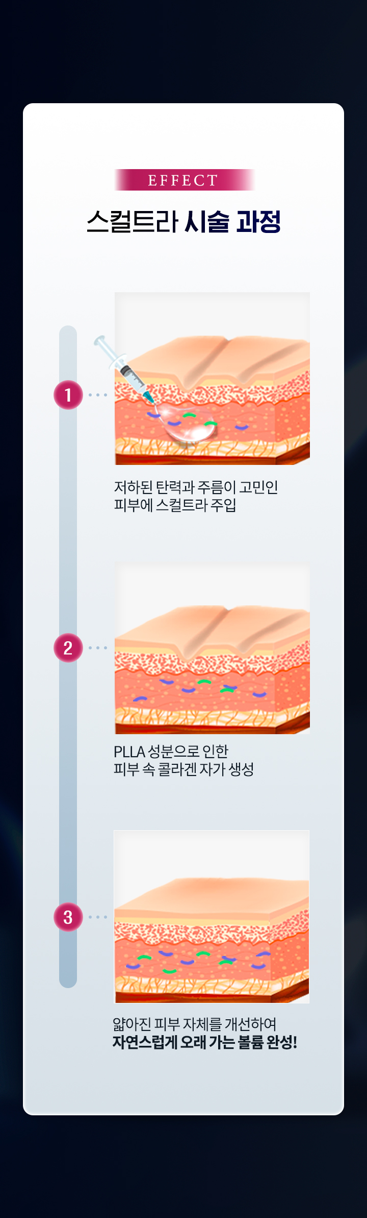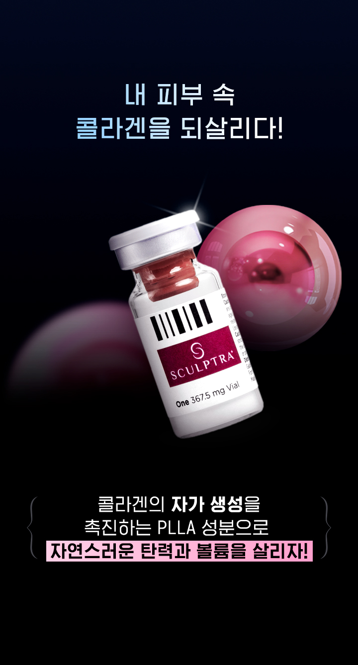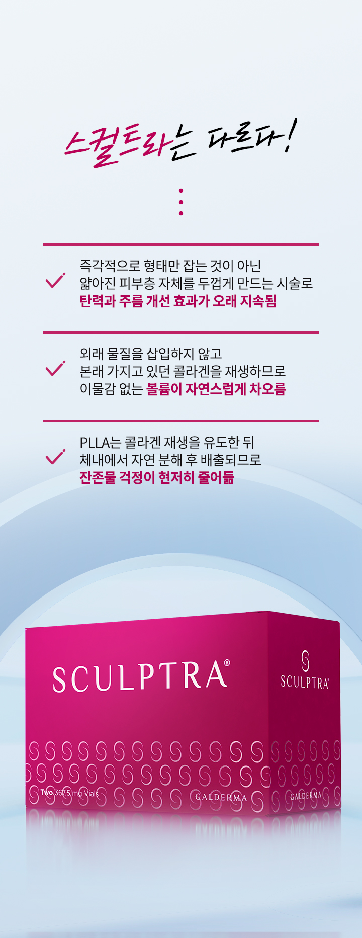 스컬트라는 PLLA라는 콜라겐생성유도물질로 구성된 시술로, 피부에 주입되면 콜라겐의 지속적인 재생성을 유도합니다. 이로 인해 꺼진 부위에는 볼륨이 차오르고 피부탄력이 개선되는 효과를 기대할 수 있는 시술입니다.