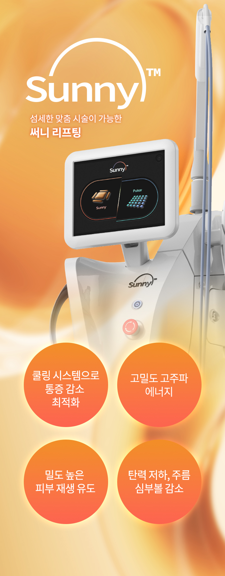 써니리프팅은 고주파(RF) 에너지를 이용하여 피부 탄력 개선 및 리프팅 효과를 얻는 비침습적 시술입니다. 6.78MHz 고주파를 사용하며, 콜라겐 재생을 유도하고, 다양한 핸드피스(써니/펄사)를 통해 얼굴 윤곽, 처짐, 주름, 피부톤, 색소침착 등 복합적인 피부 고민을 개선할 수 있습니다. 통증이 적고 회복이 빠르며, 맞춤형 시술이 가능하다는 장점이 있습니다.