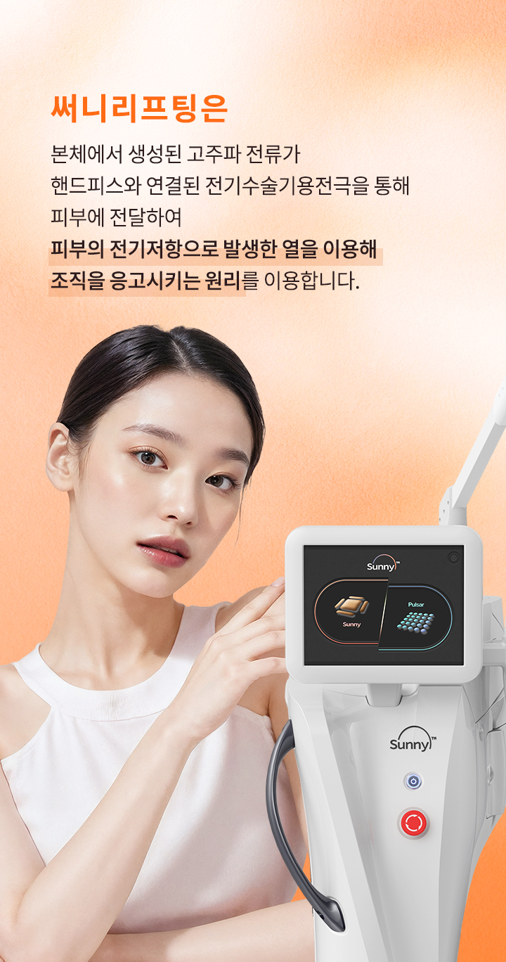 써니리프팅은 본체에서 생성된 고주파 전류가 핸드피스와 연결된 전기수술기용전극을 통해 피부에 전달하여 피부의 전기저항으로 발생한 열을 이용해 조직을 응고시키는 원리를 이용합니다.