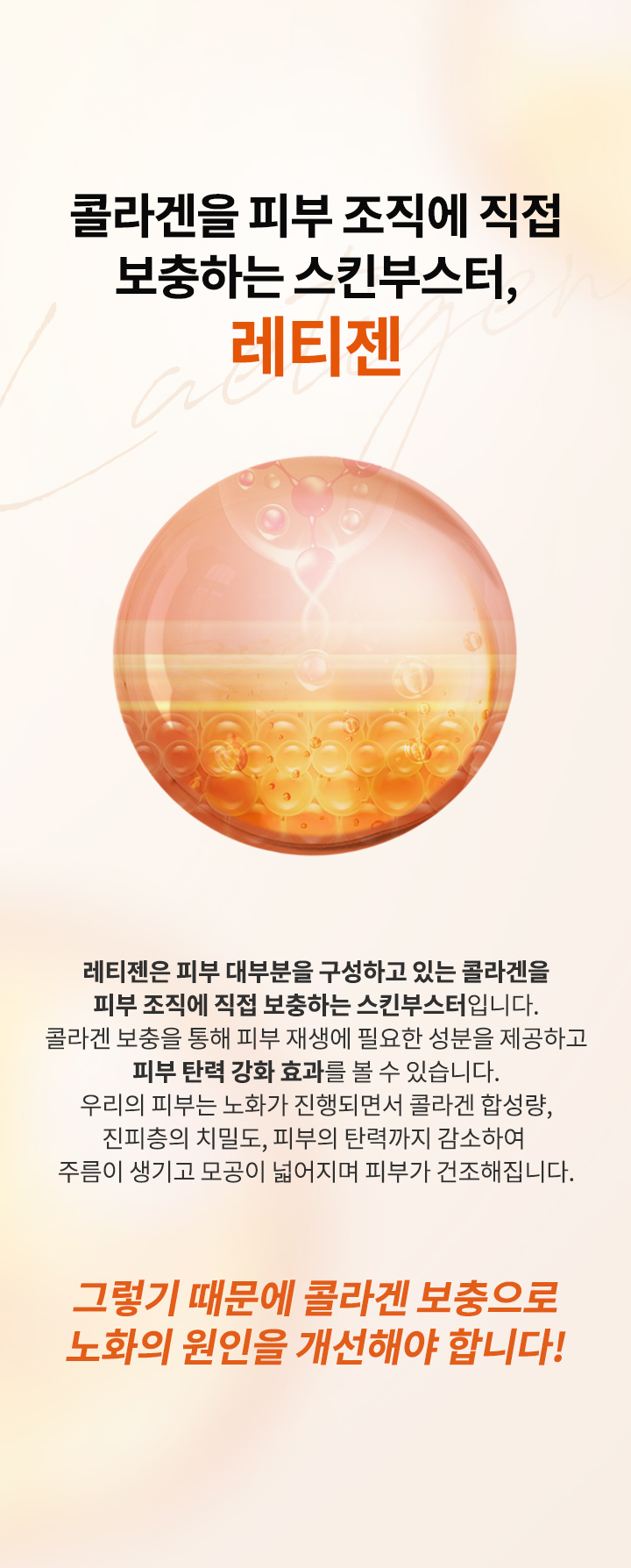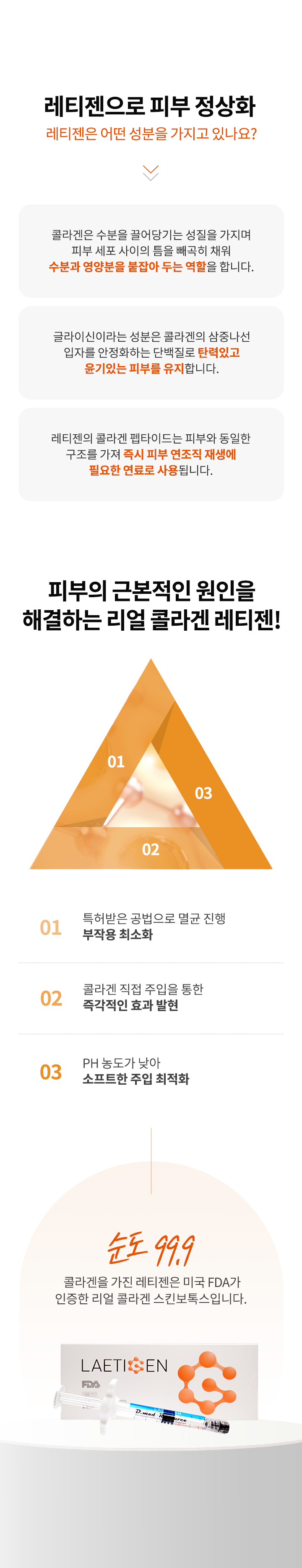 이번에 FDA 승인을 받아 신규런칭한 "레티젠"은 진피층에 큰 역할을 담당하는 Type 1 콜라겐(99.9%)을 피부에 직접 주사, 손상된 피부조직을 대체하여 모공축소/ 피부치밀도증가/ 유수분밸런스조절/ 피부탄력/ 피부결&톤개선 의 효과가 있고 궁극적으로 피부장벽을 강화시키고, 즉각적인 탄력감을 느끼게 합니다.