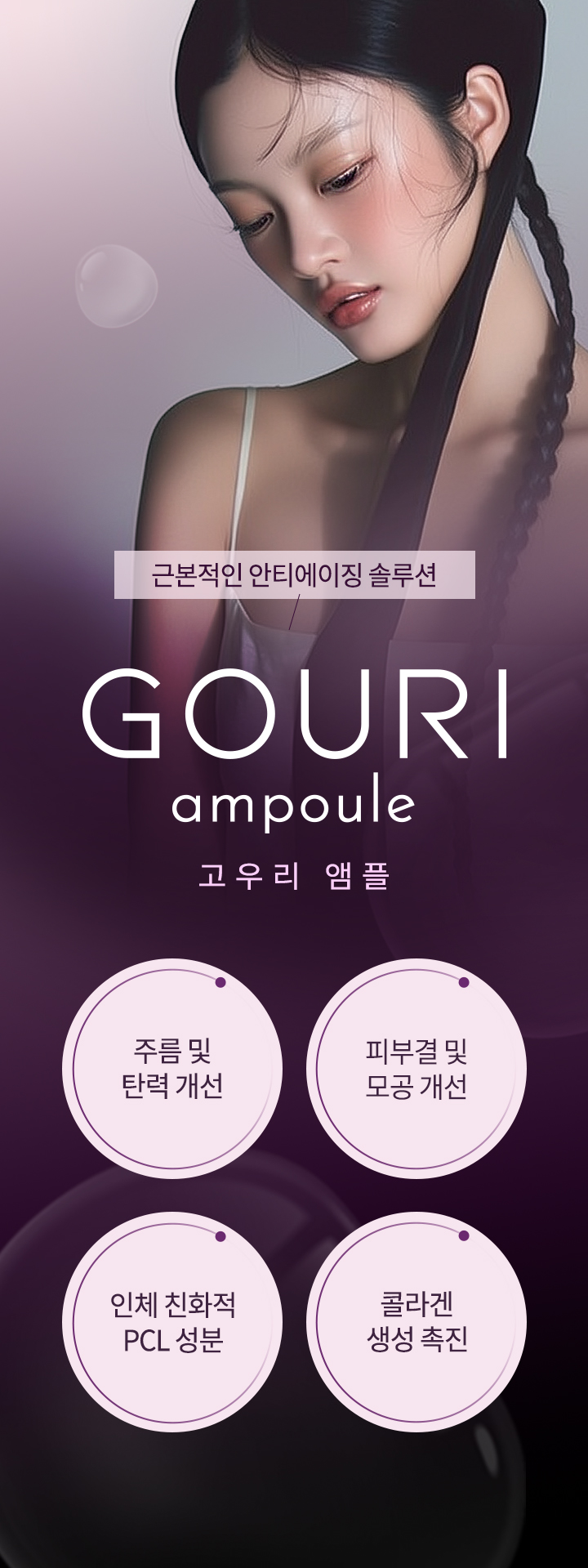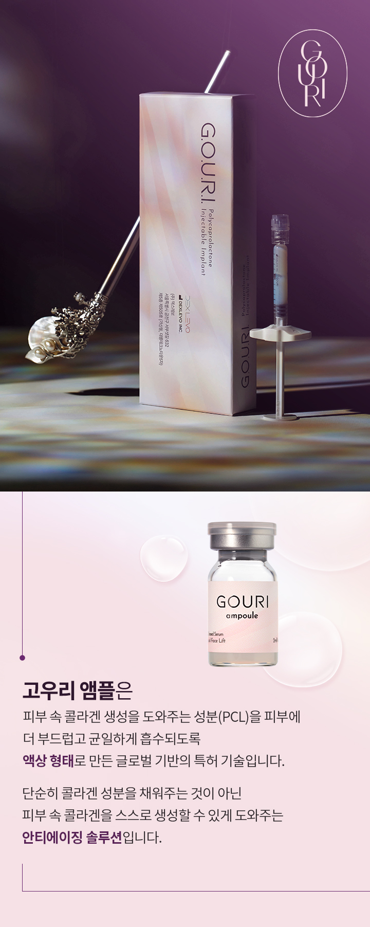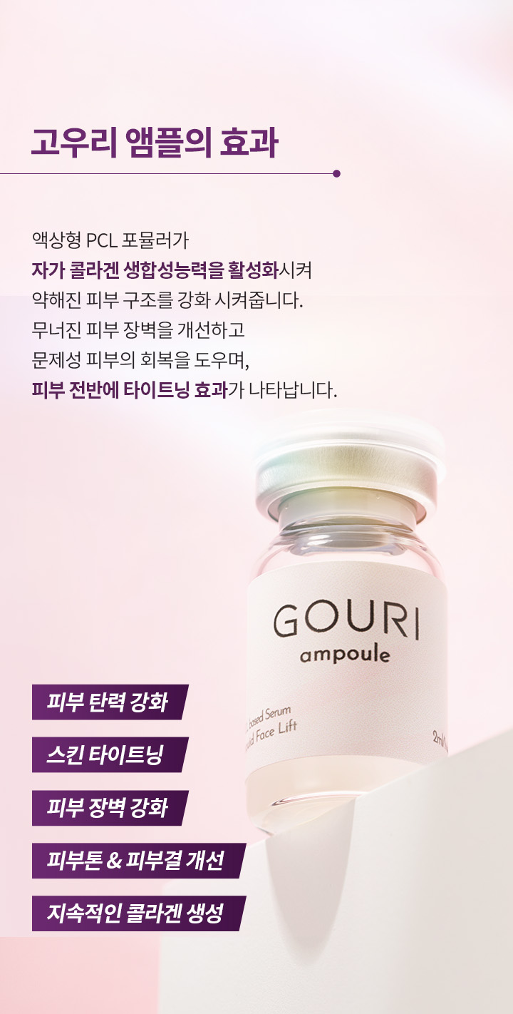 고우리 앰플은 피부 속 콜라겐 생성을 도와주는 성분(PCL)을 피부에