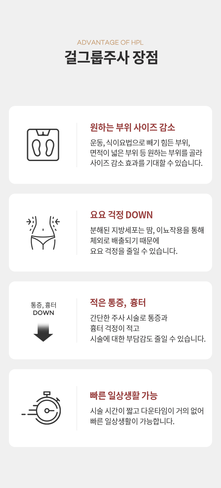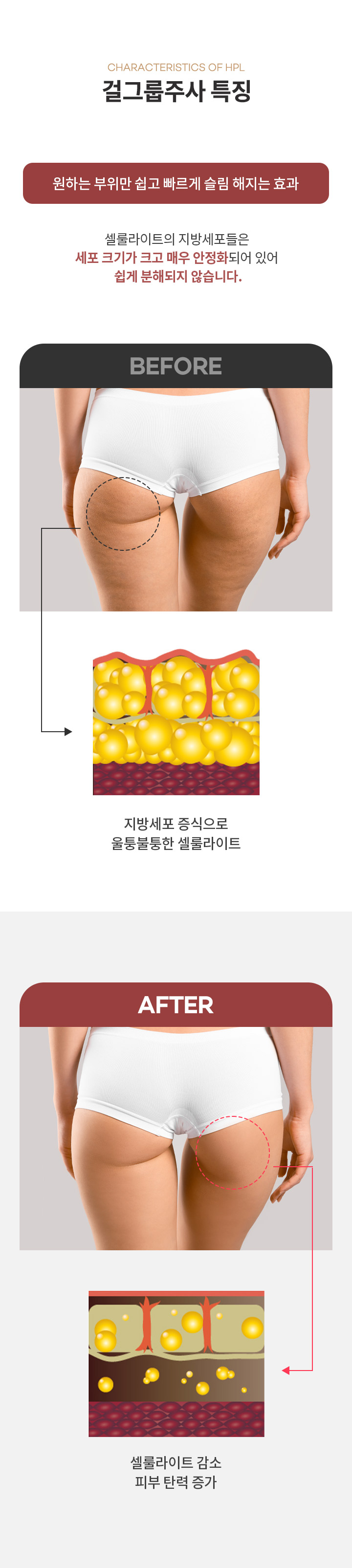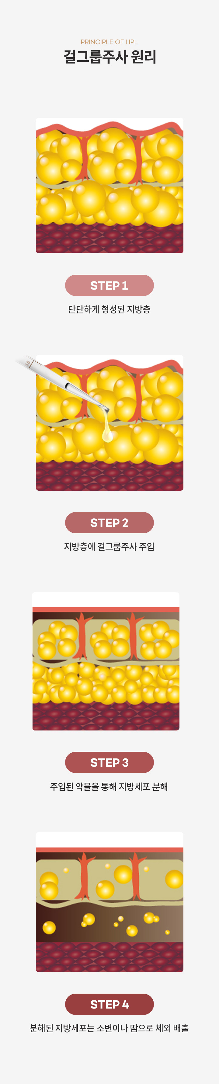 걸그룹주사(HPL)란 삼투압 원리를 이용해 단시간 내에 지방세포를 파괴하여 분해시키는 시술입니다.