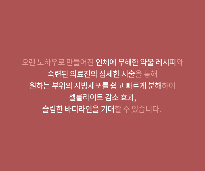 톡스앤필만의 오랜 노하우로 만들어진 약물 레시피를 이용하여, 원하는 부위의 지방분해 효과와 라인개선을 도와주는 시술입니다.